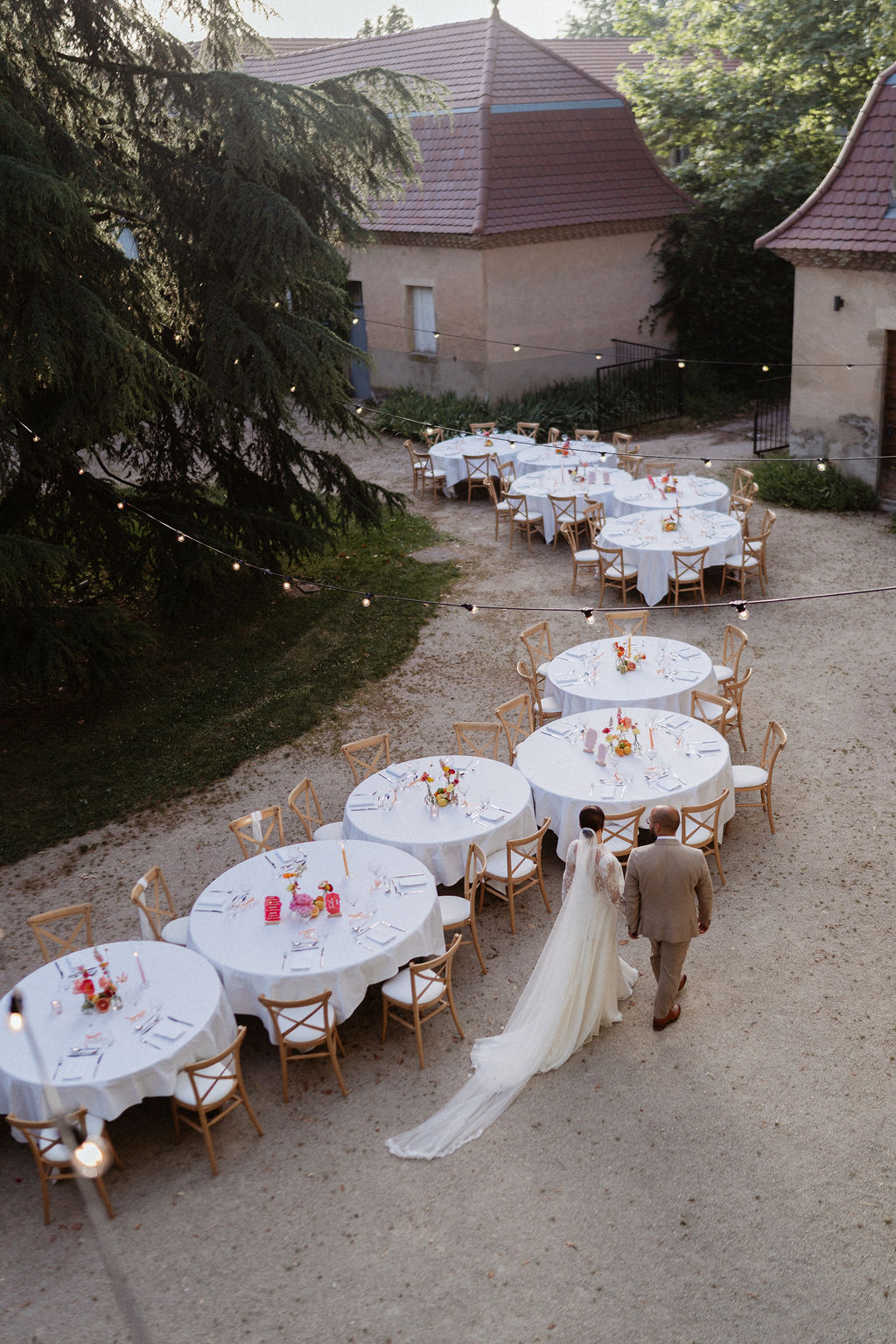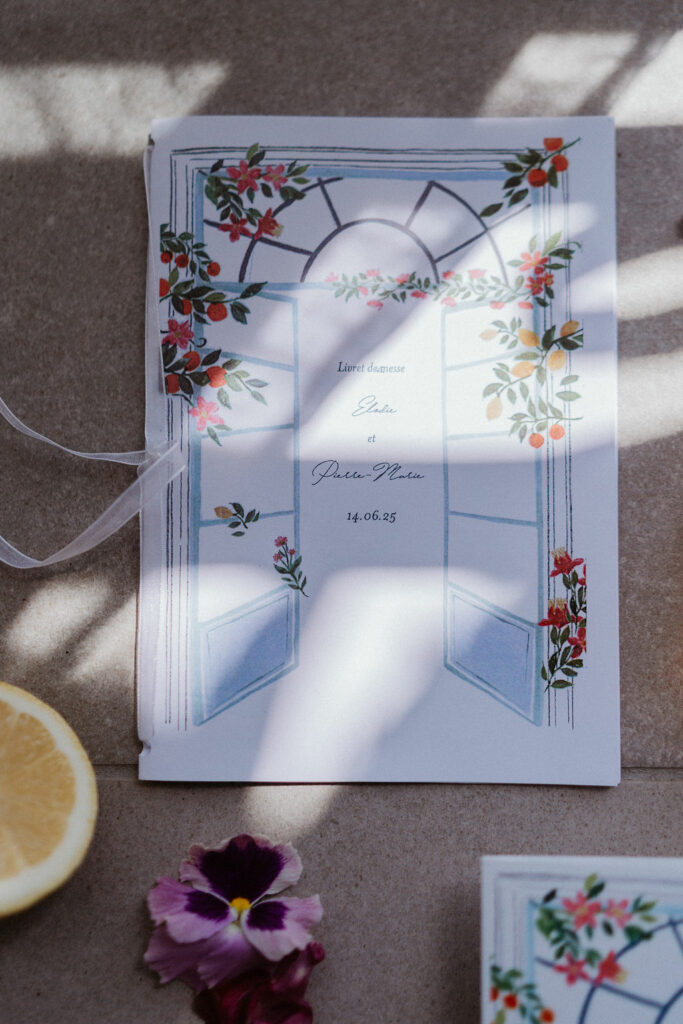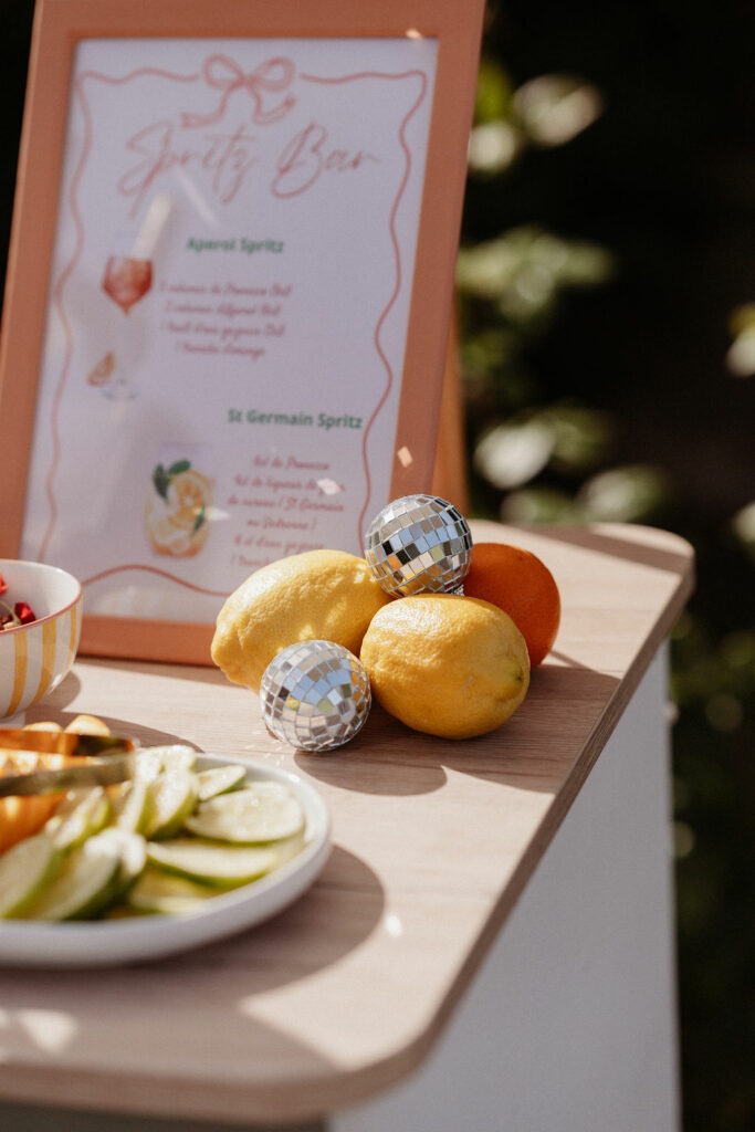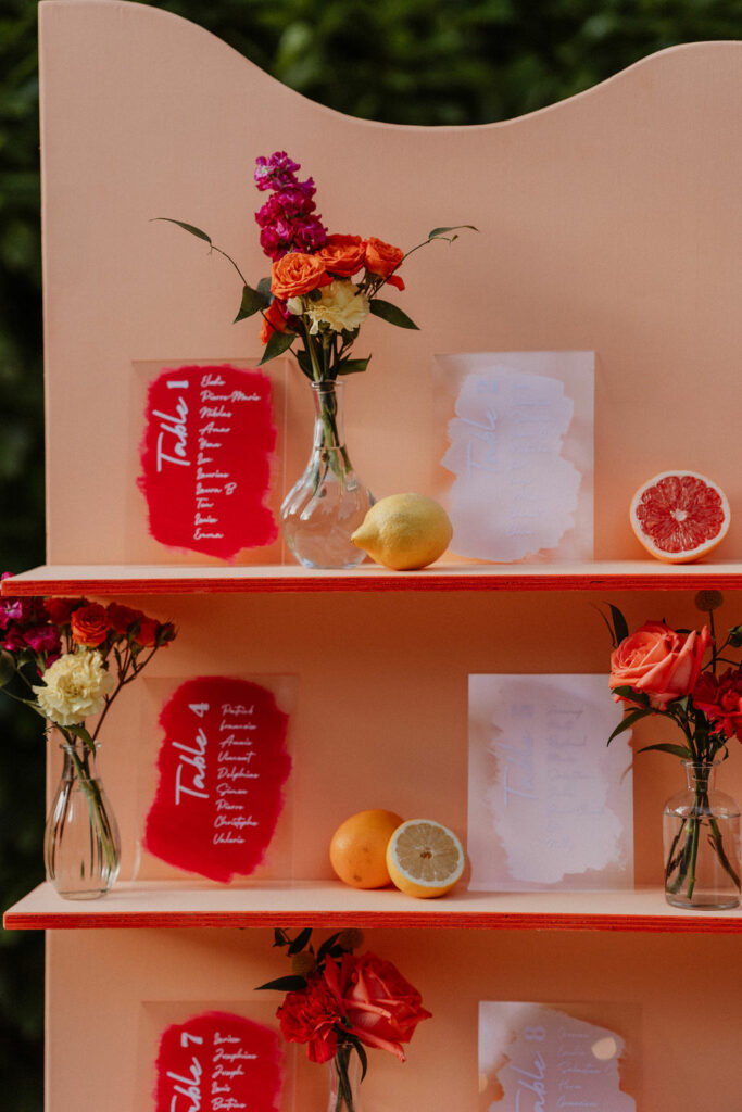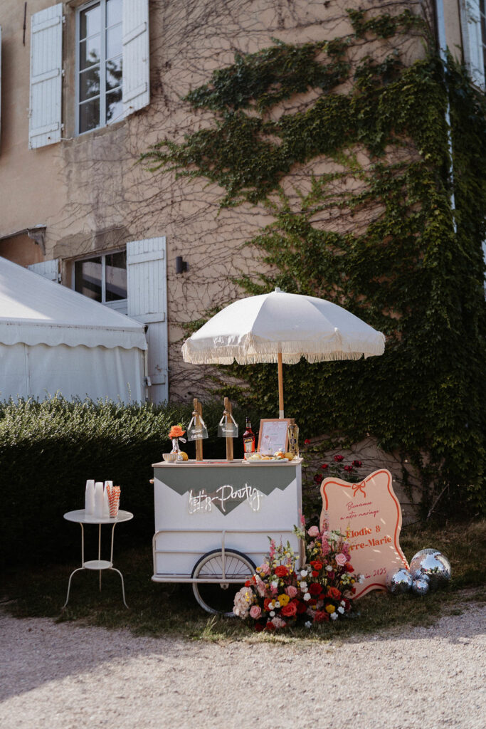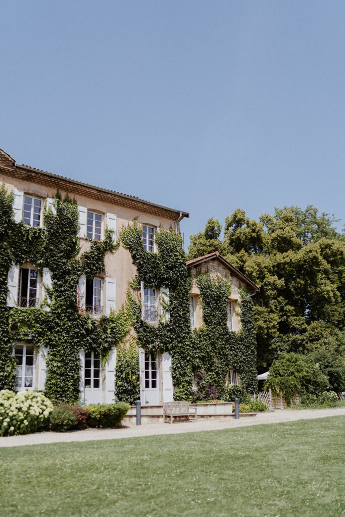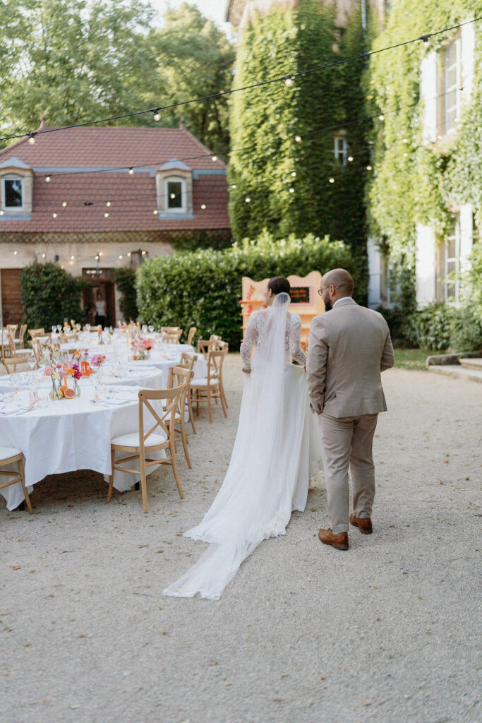 Nous souhaitions initialement nous marier en Provence, mais, pour des raisons de logistique familiale, il était finalement plus simple d’organiser notre mariage autour de Lyon. Heureusement, nous avons eu la chance de trouver un domaine aux inspirations provençales : le Château de Césarges. Nous avons choisi pour thème la Dolce Vita, avec des couleurs vitaminées, des agrumes, un repas en extérieur, des tables en serpentin, des guirlandes guinguettes et une végétation généreuse, etc. L’ambiance que nous imaginions prenait peu à peu vie.