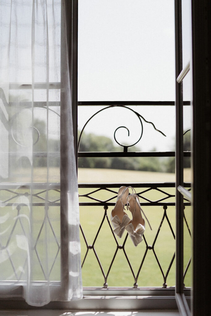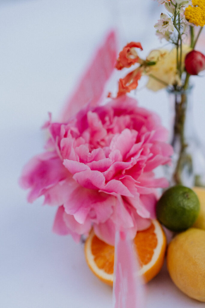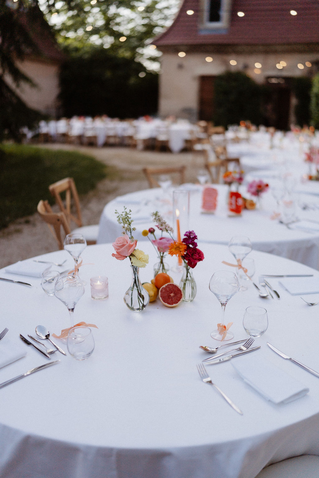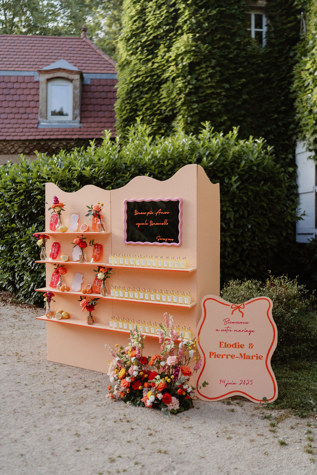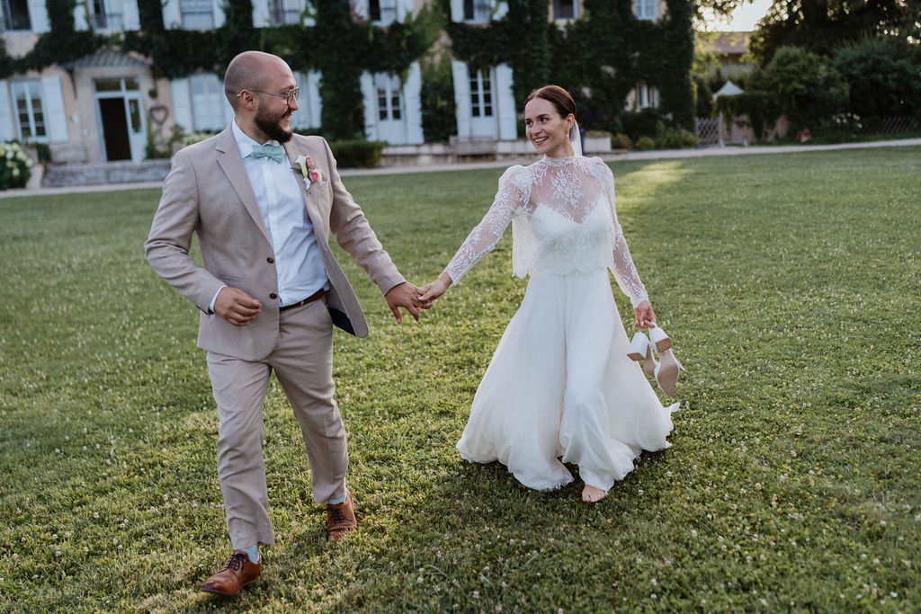Nous souhaitions initialement nous marier en Provence, mais, pour des raisons de logistique familiale, il était finalement plus simple d’organiser notre mariage autour de Lyon. Heureusement, nous avons eu la chance de trouver un domaine aux inspirations provençales : le Château de Césarges. Nous avons choisi pour thème la Dolce Vita, avec des couleurs vitaminées, des agrumes, un repas en extérieur, des tables en serpentin, des guirlandes guinguettes et une végétation généreuse, etc. L’ambiance que nous imaginions prenait peu à peu vie.