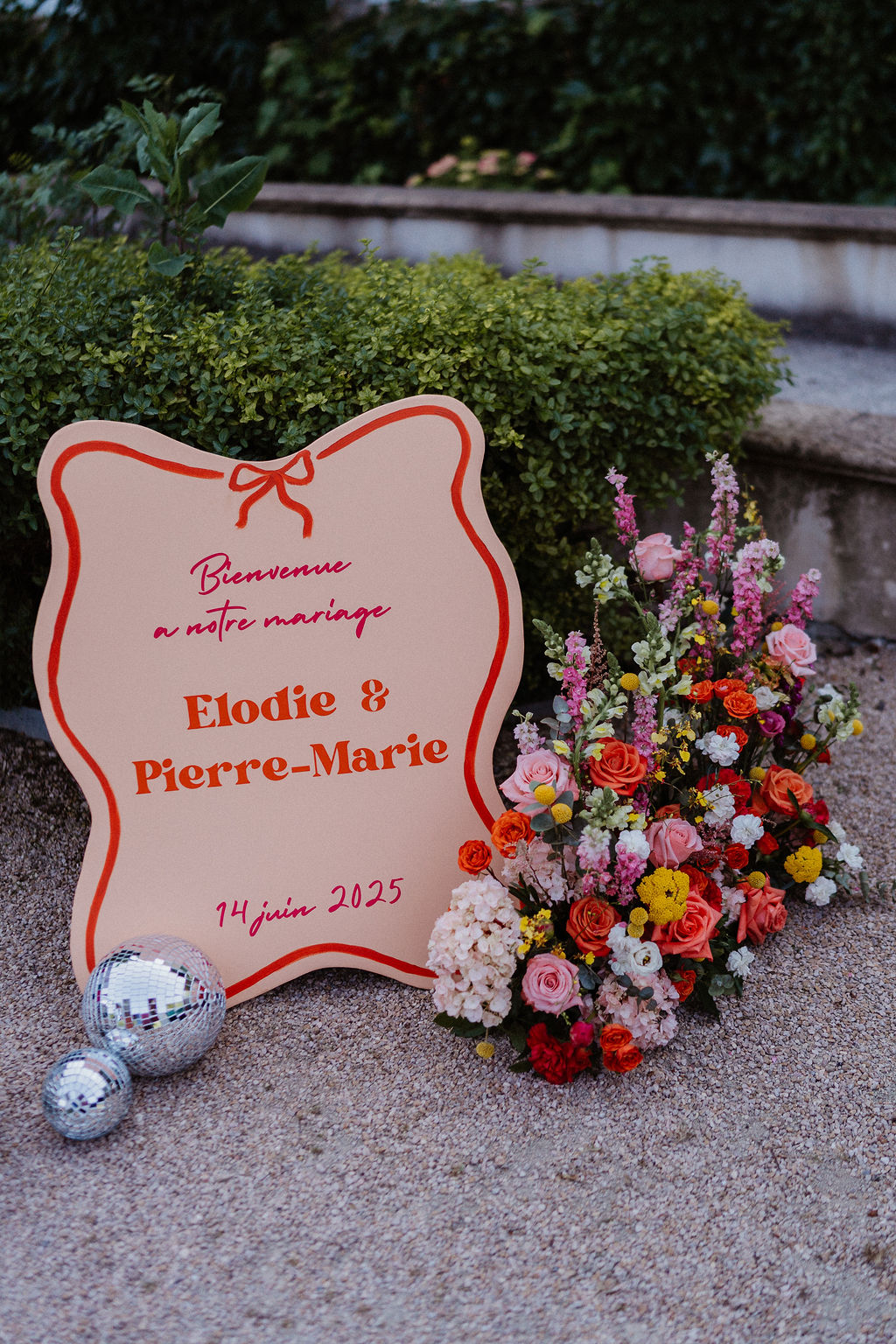 Nous souhaitions une organisation très spécifique : des tables rondes disposées en serpentin pour un repas en extérieur, au cœur de la magnifique cour intérieure du Château de Césarges. Cependant, cette configuration représentait un véritable casse-tête pour l’élaboration du plan de table, qui devait pouvoir être transposé en intérieur en cas d’intempérie, sans avoir à modifier toute la signalétique. Heureusement, ce défi de taille a été parfaitement relevé grâce au talent de notre décoratrice, Laurianne, qui a su trouver une solution élégante et pratique.