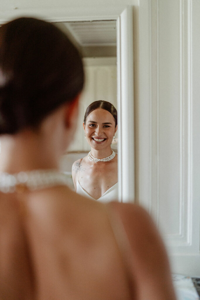 Notre plus beau souvenir reste sans aucun doute le moment de la révélation, lorsque nous nous sommes découverts pour la première fois, juste tous les deux, dans l’intimité, avant le début des cérémonies. C’est également à cet instant que nous avons échangé nos vœux.