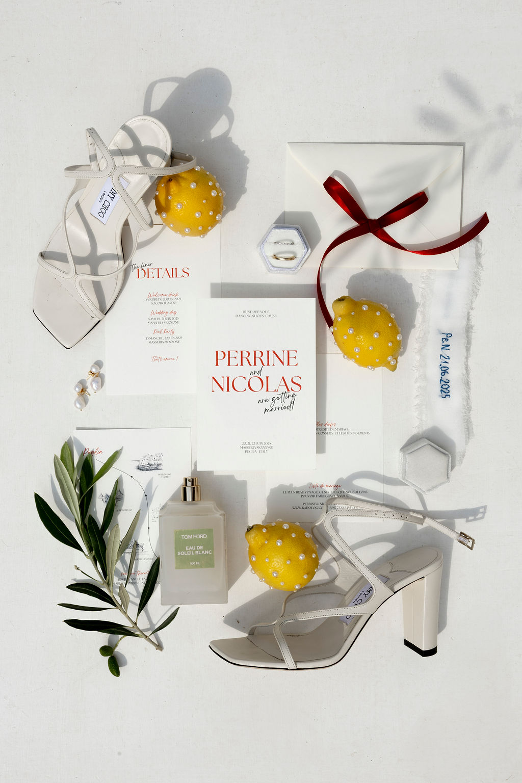 Pour le reste, je voulais absolument profiter de ma journée car je sais que cela passe très vite, c’est pourquoi nous avons pris une wedding planner. Cela nous a permis de ne venir que deux fois en Italie avant le mariage : une fois pour la visite, et une seconde pour le « wedding day » en avril 2025 afin de choisir le menu, finaliser la déco, les détails, etc.