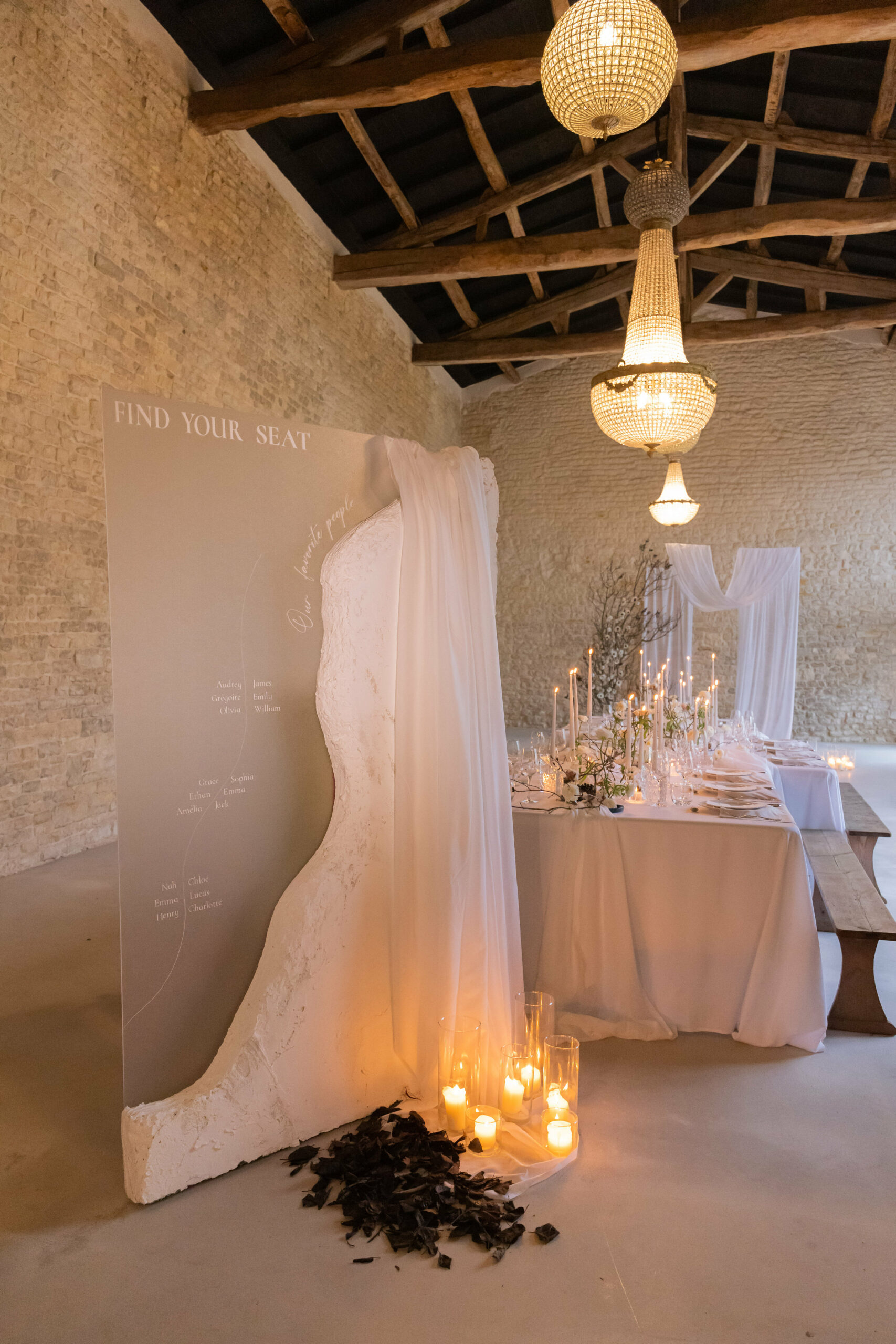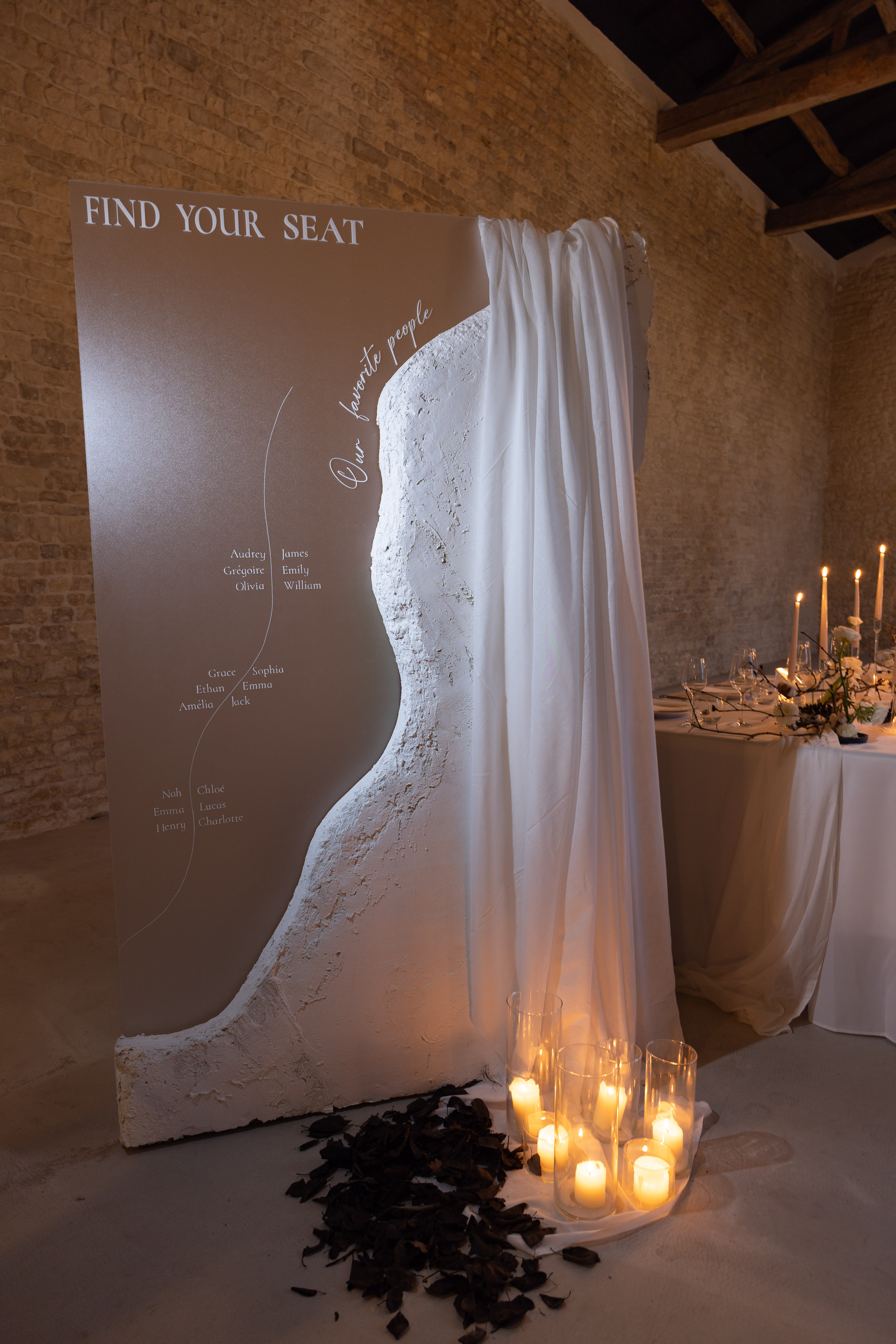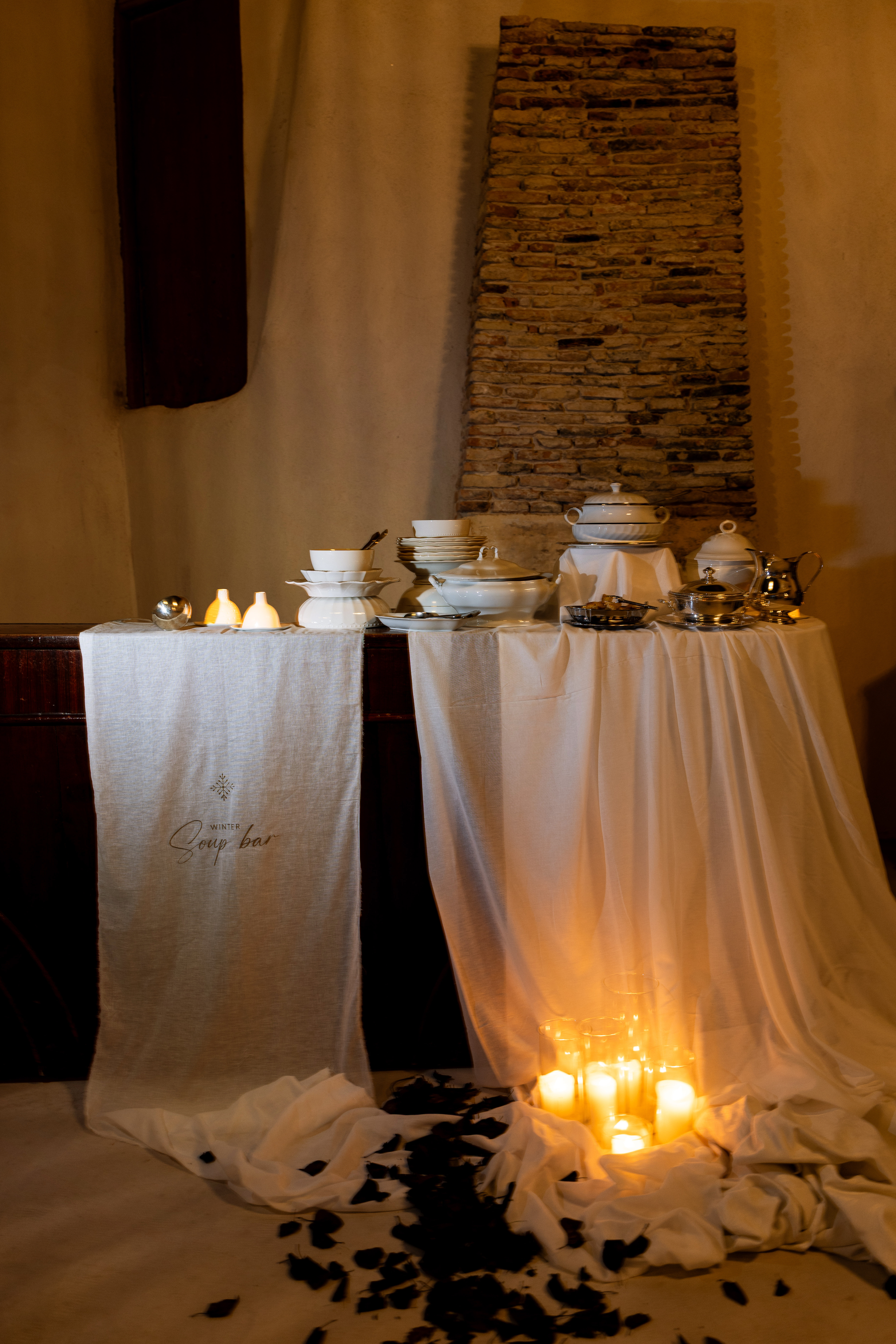 L’inspiration est née du contraste propre à cette saison : le froid mordant et la lumière pâle, face à la chaleur enveloppante des bougies, des matières et des moments partagés. Aussi, ce dialogue entre rigueur et réconfort a guidé nos choix créatifs, donnant naissance à un décor jouant sur les oppositions tout en conservant une grande douceur visuelle. Ensemble, nous avons alors imaginé un univers sobre, chic et lumineux, où chaque élément trouve naturellement sa place. La mise en scène se veut volontairement déstructurée : une installation florale aérienne aux voilages flottants, des tables disposées en quinconce pour casser la symétrie, un bar à soupe invitant au partage et des compositions florales asymétriques, légères, presque suspendues.