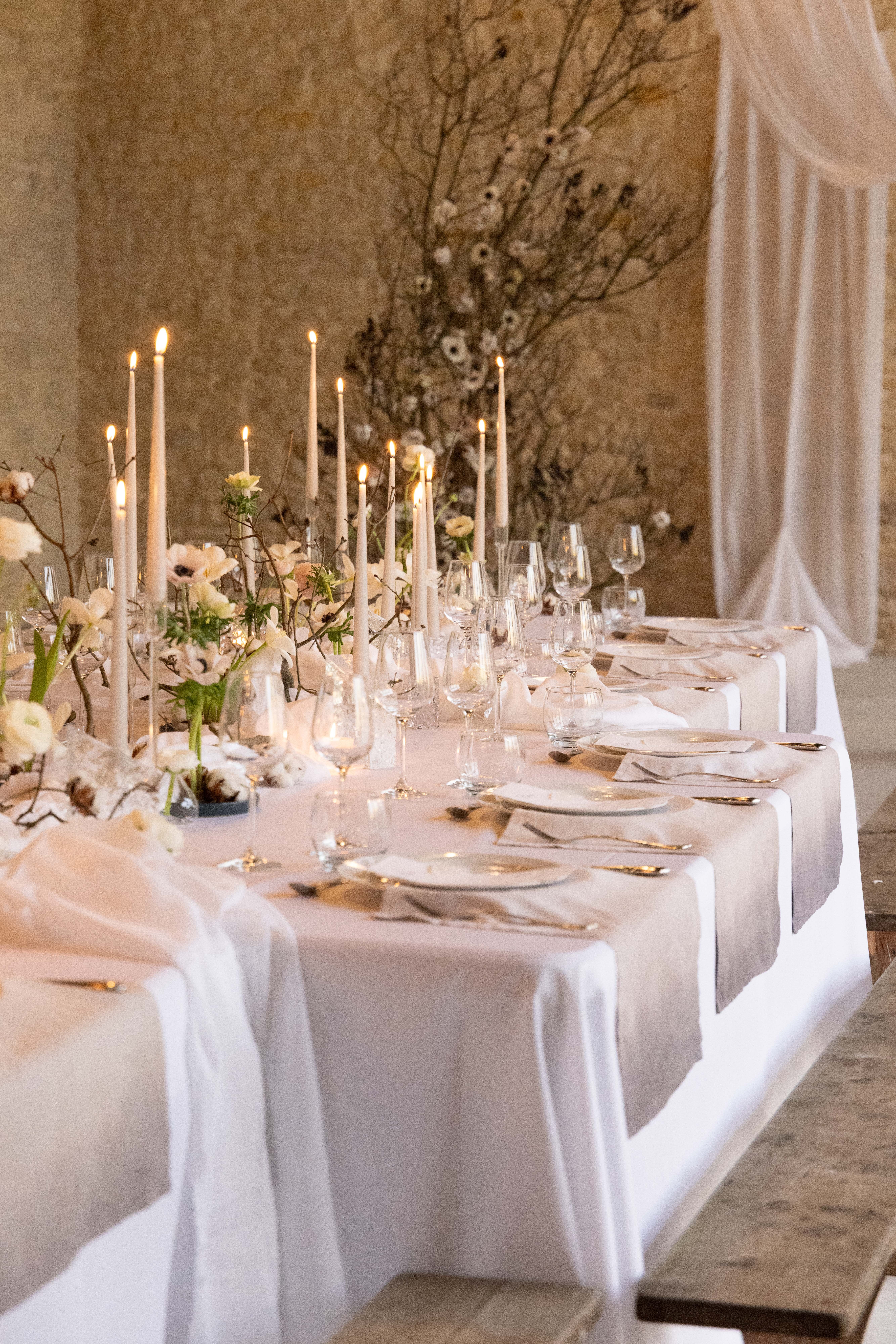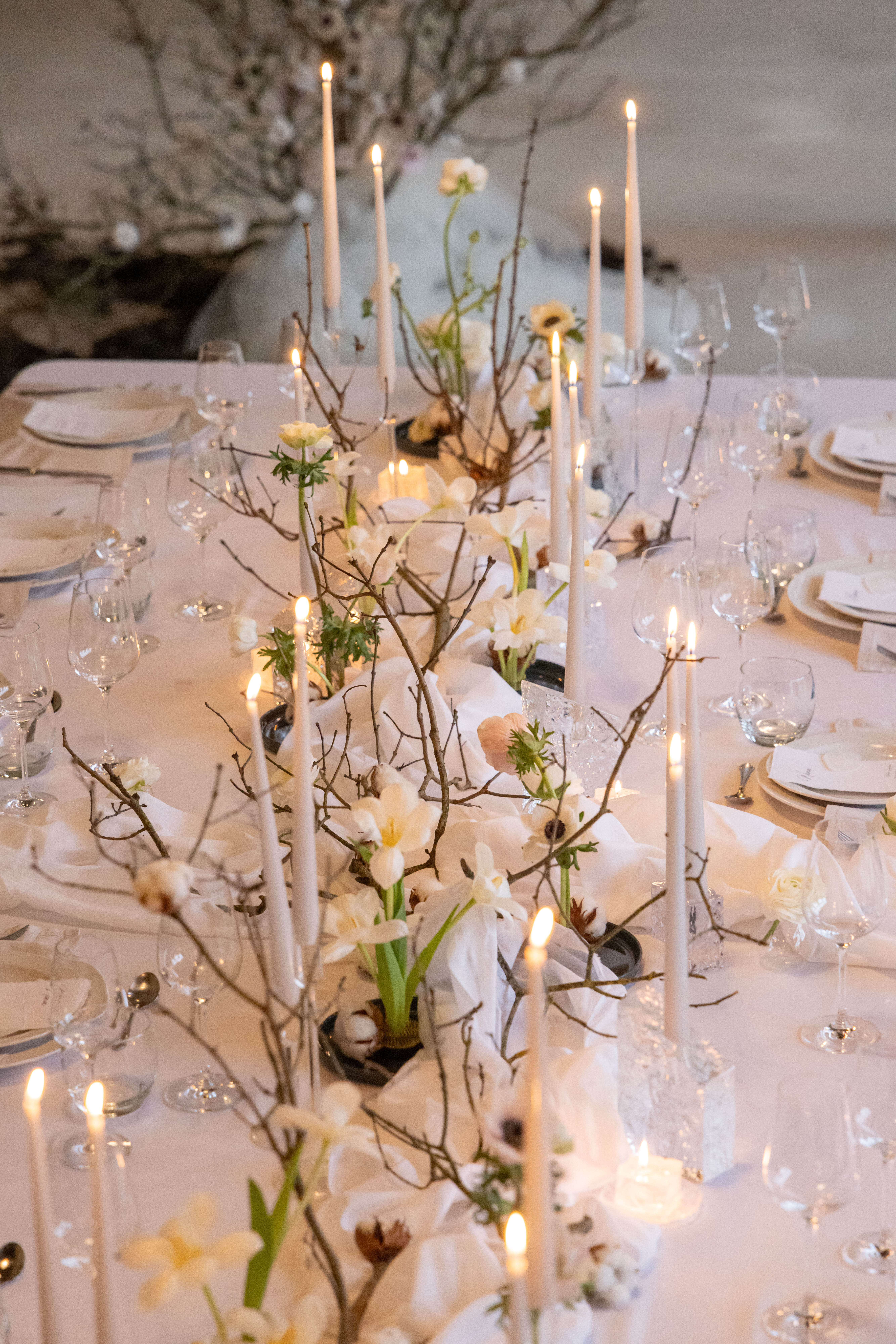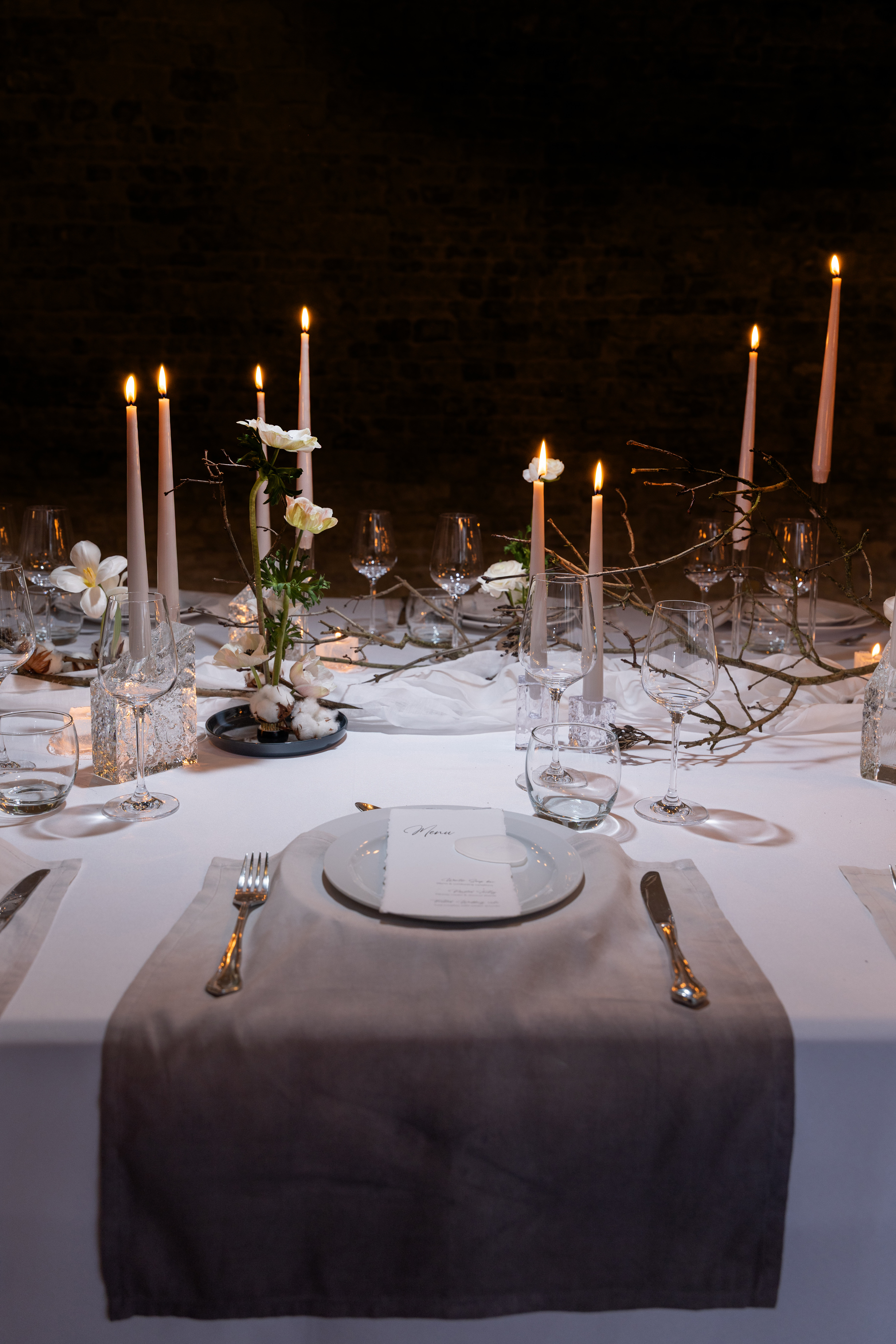 La palette chromatique, froide et épurée (blanc, gris, argent), sublime la lumière hivernale. Les textures prennent alors toute leur importance : tissus fluides, transparences délicates, mono-fleurs minimalistes, tandis que l’éclat doux des bougies vient réchauffer l’ensemble et créer une atmosphère intime et feutrée.