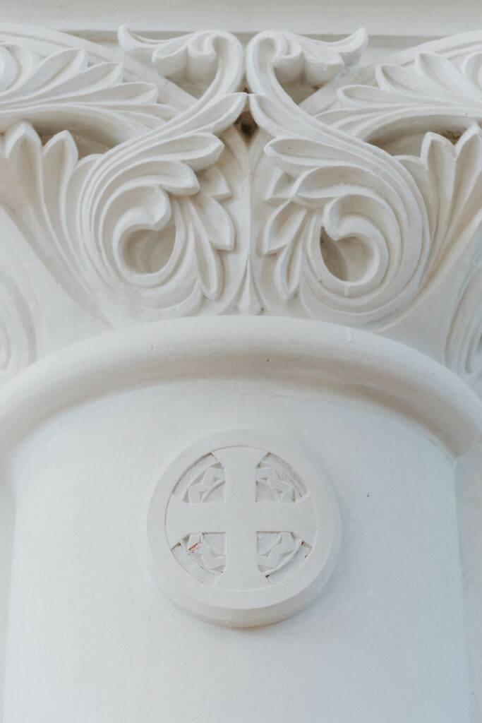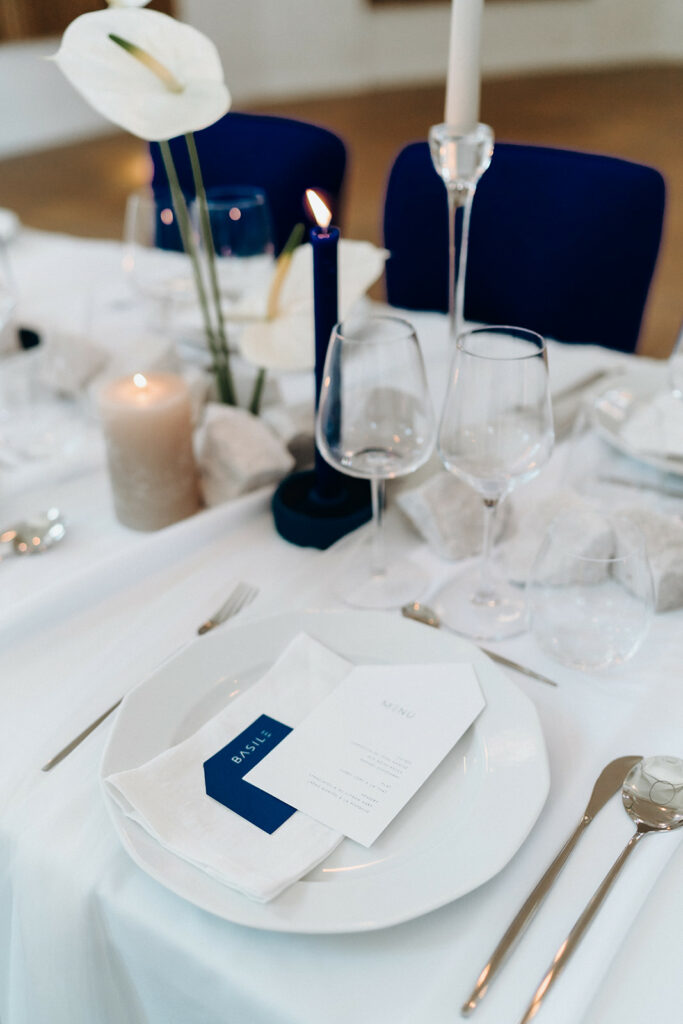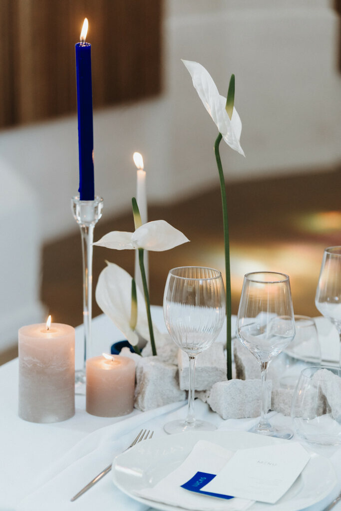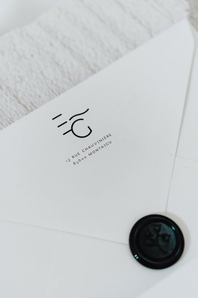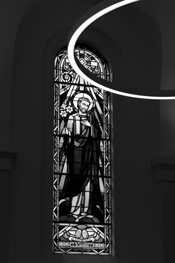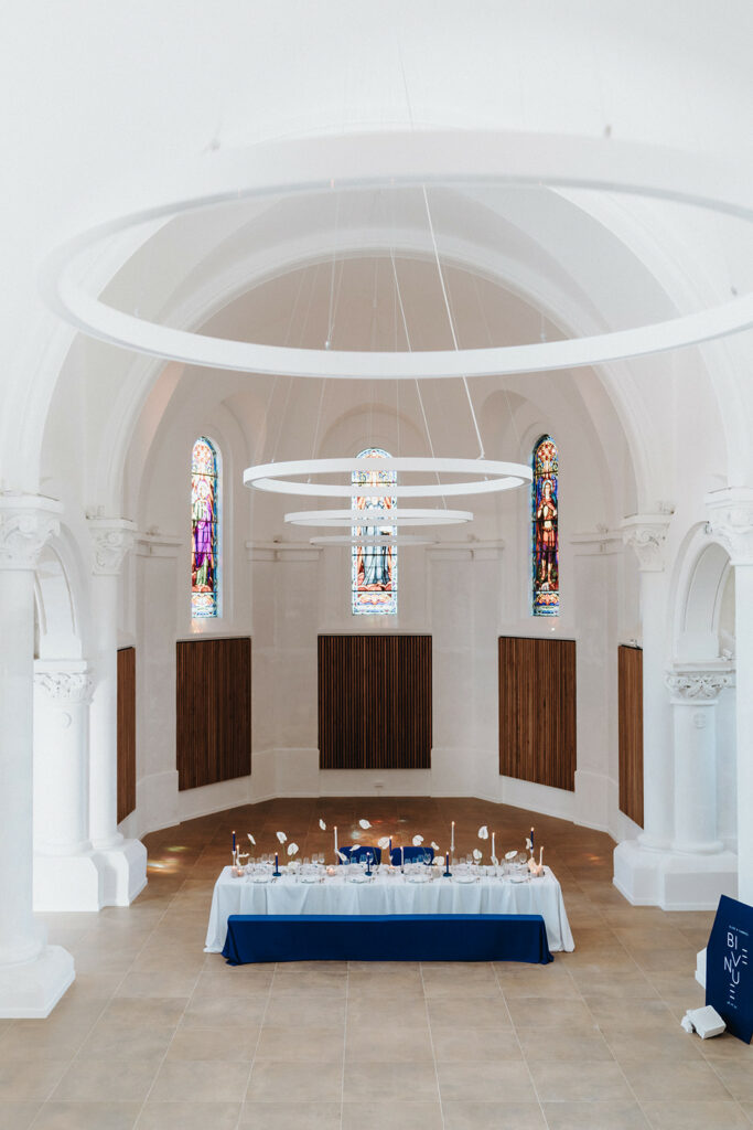 Ce lieu unique, entouré de nature et baigné de lumière, s’est imposé comme une évidence. L’inspiration est née des vitraux colorés et des murs de pierre, témoins du temps. Nous avons voulu placer ce décor au cœur du projet, en laissant parler sa beauté brute. De l’une des teintes des vitraux est née notre palette artistique : une nuance délicate autour de laquelle se sont tissées la matière de la pierre, la douceur des drapés, et la modernité de l’art de la table et de la papeterie. Ainsi, le contemporain s’est fondu dans l’histoire, dans un dialogue harmonieux entre passé et présent, pour un rendu à la fois intemporel et raffiné.