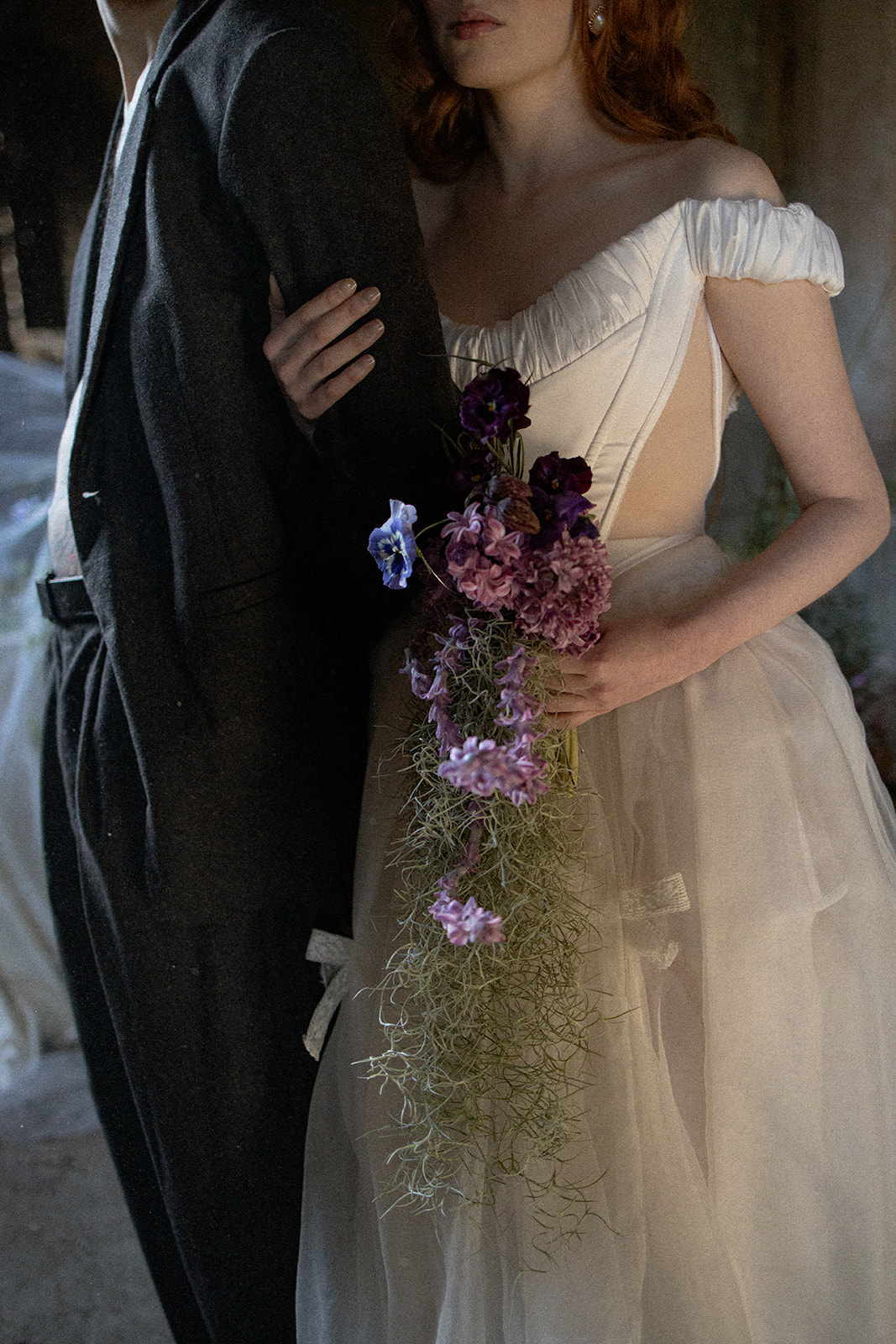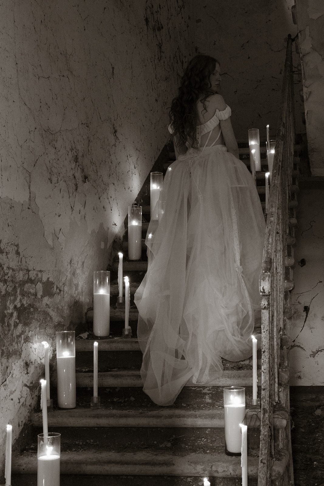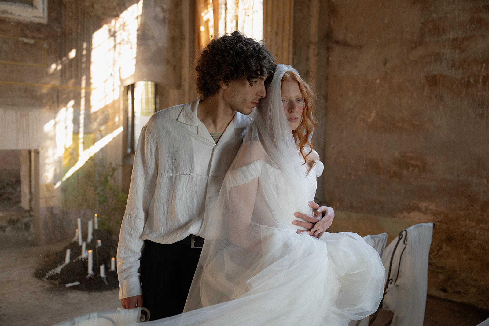Installé dans un bâtiment à l’abandon, le lieu dépasse le simple rôle de décor pour devenir un véritable personnage. Les matières brutes, les lignes et les volumes laissés vides semblent chargés de souvenirs, baignés d’une mélancolie. Dans cet environnement austère, la douceur s’invite par touches : des pensées délicates et des superpositions de tulle apportent une poésie fragile, presque fugace, comme les premiers élans d’un amour encore vulnérable.