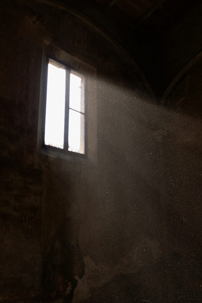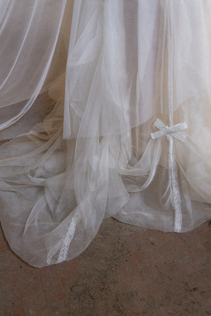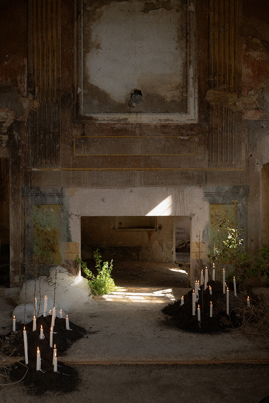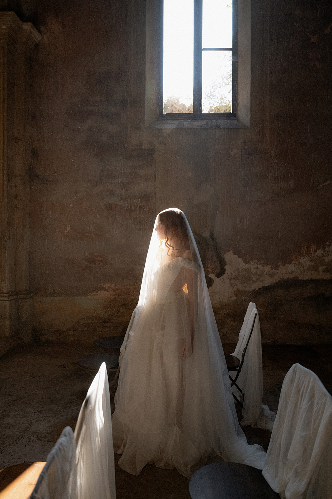 Installé dans un bâtiment à l’abandon, le lieu dépasse le simple rôle de décor pour devenir un véritable personnage. Les matières brutes, les lignes et les volumes laissés vides semblent chargés de souvenirs, baignés d’une mélancolie. Dans cet environnement austère, la douceur s’invite par touches : des pensées délicates et des superpositions de tulle apportent une poésie fragile, presque fugace, comme les premiers élans d’un amour encore vulnérable.