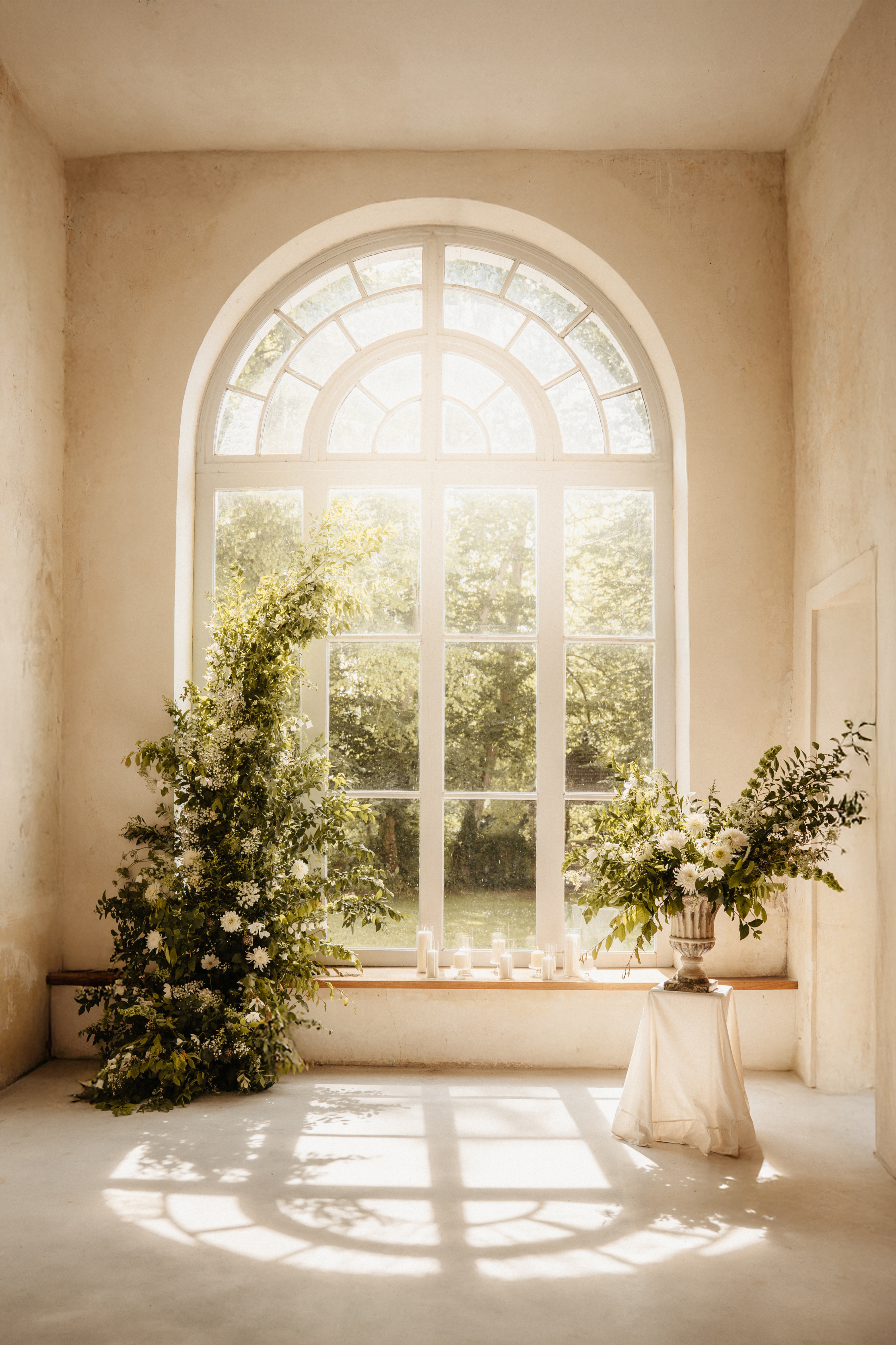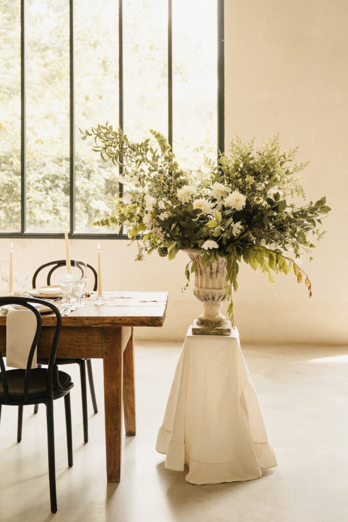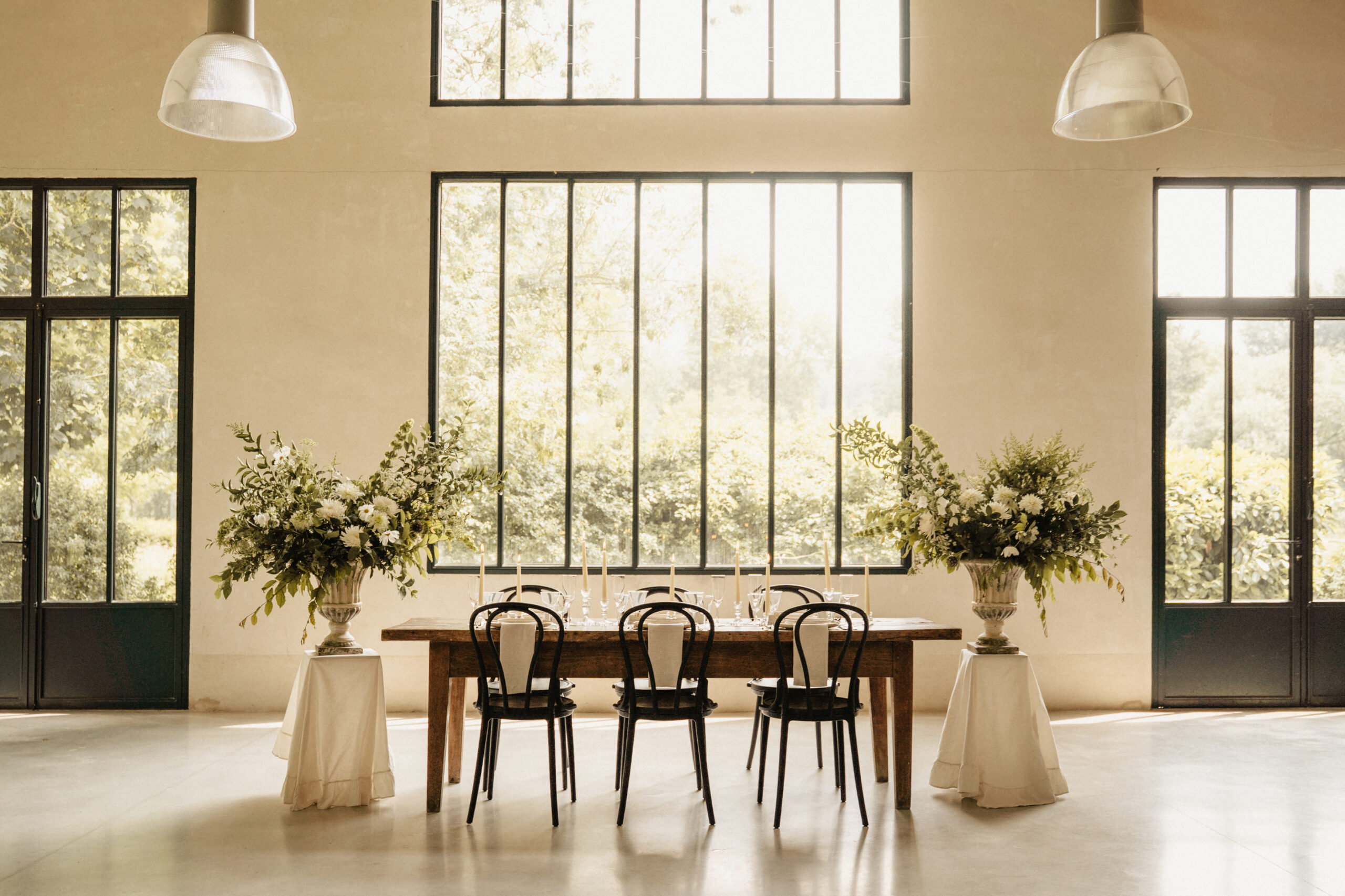 Pensé comme un elopement intimiste, ce shooting explore un équilibre subtil entre nature et matière. La palette mêle verts tendres, blancs lumineux et délicates touches de rose, dans une scénographie épurée où chaque élément trouve sa place. Ici, la décoration ne s’impose pas : elle dialogue avec l’architecture et révèle la beauté du lieu. La végétation devient le fil conducteur de cette mise en scène, apportant douceur et poésie à l’authenticité brute du moulin. Chaque détail participe à une atmosphère organique, sincère et résolument contemporaine, fidèle à l’esprit des mariages intimistes d’aujourd’hui.