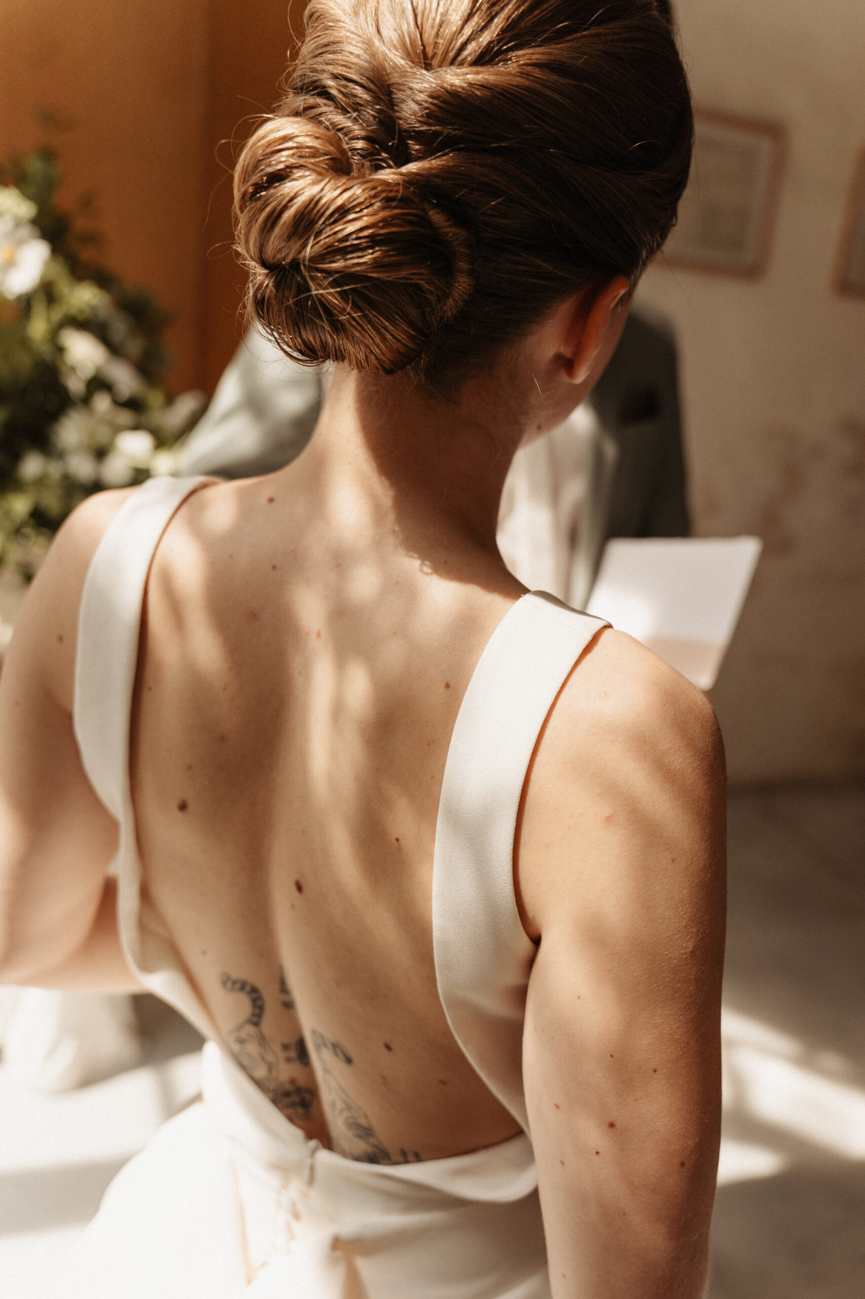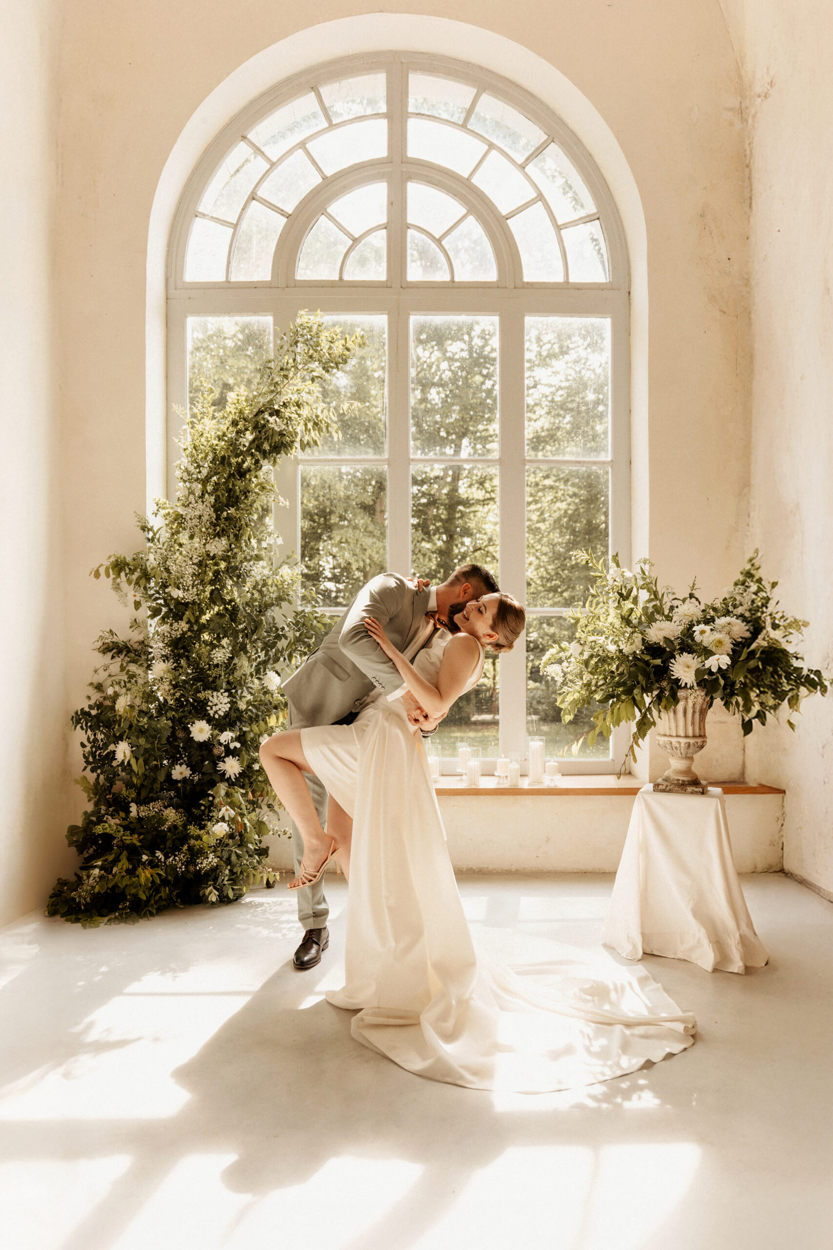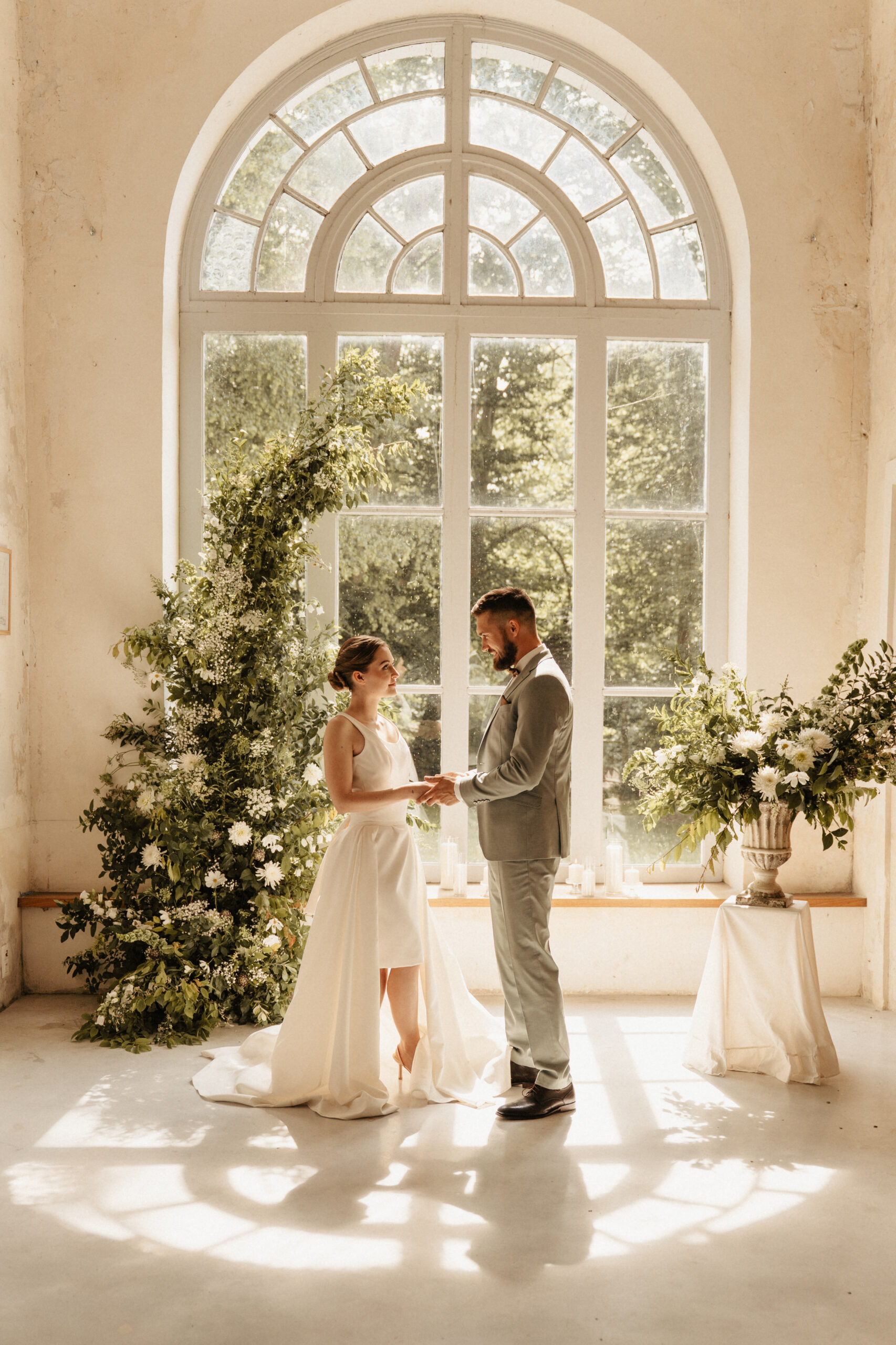 Pensé comme un elopement intimiste, ce shooting explore un équilibre subtil entre nature et matière. La palette mêle verts tendres, blancs lumineux et délicates touches de rose, dans une scénographie épurée où chaque élément trouve sa place. Ici, la décoration ne s’impose pas : elle dialogue avec l’architecture et révèle la beauté du lieu. La végétation devient le fil conducteur de cette mise en scène, apportant douceur et poésie à l’authenticité brute du moulin. Chaque détail participe à une atmosphère organique, sincère et résolument contemporaine, fidèle à l’esprit des mariages intimistes d’aujourd’hui.